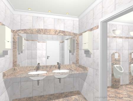 Waschtisch, Spiegelkonzeption, Bodenfliesen Bordüren und Urinalwände im lebhaften Granit Juparana Colombo.